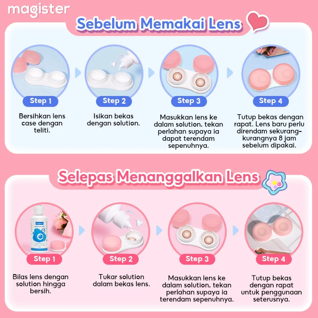 • Complete package include : a) Contact Lenses (2 Boxes)  b) 100ml solution (1 Bottle)   c) Tweezers & Applicator (1 Set)   d) 2 Free Cases
